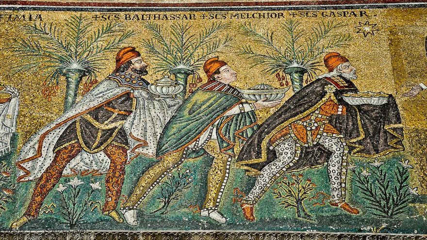 Los nombres actuales de los tres reyes magos: Melchor, Gaspar y Baltasar aparecen por primera vez en el conocido mosaico de San Apolinar el Nuevo en la ciudad de Rávena que data del siglo VI d. C., en el que se distingue a los tres magos ataviados al modo persa con sus nombres escritos encima y representando distintas edades.
