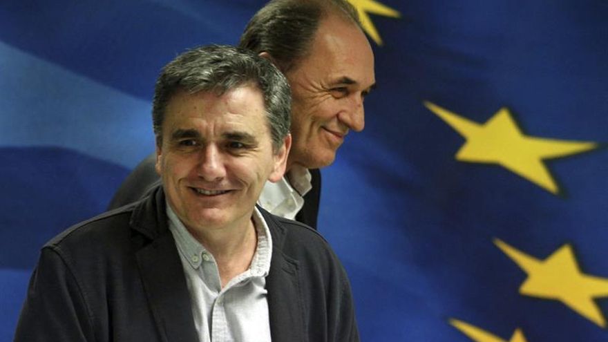 El ministro de Finanzas griego, Euclides Tsakalotos (i), y el ministro de Economía y Desarrollo, Yorgos Stathakis (d), durante una rueda de prensa en Atenas, Grecia. / EFE