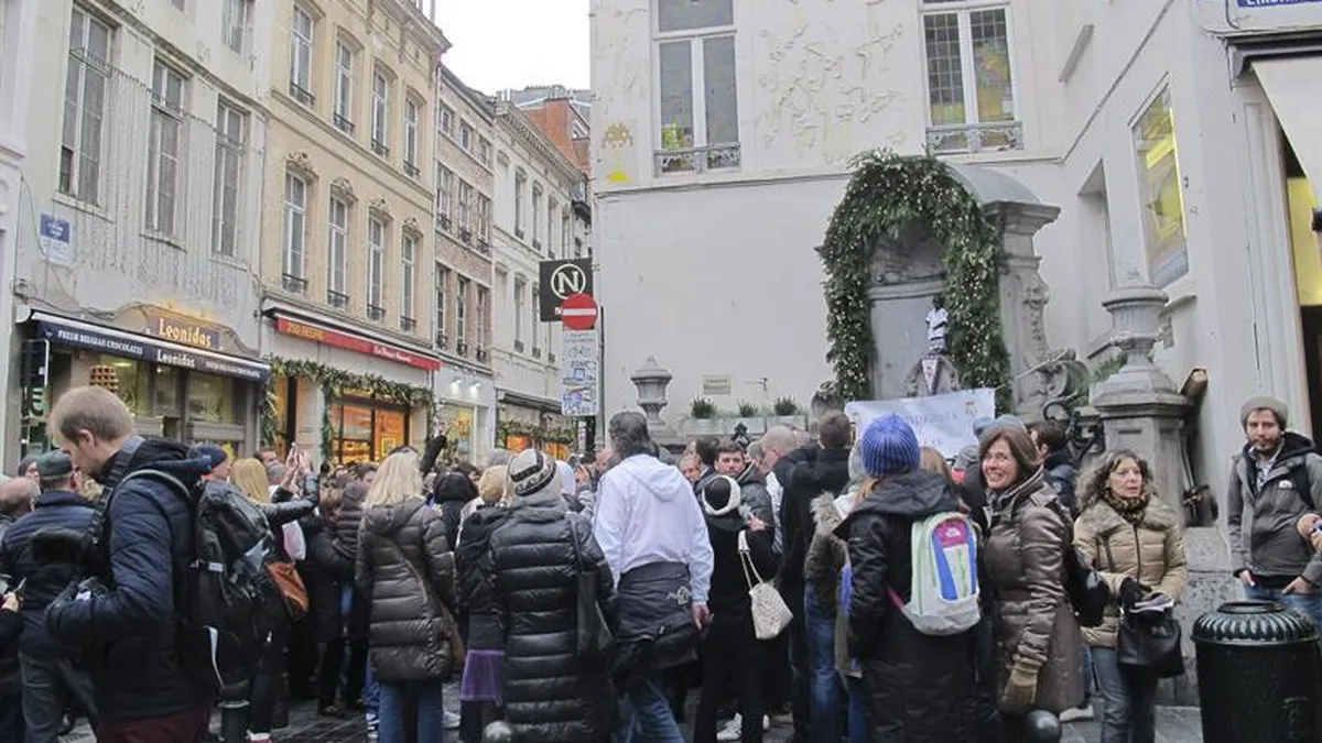 La pequeña fuente del Manneken Pis, uno de los principales símbolos de Bruselas, es contemplada por los turistas. / EFE