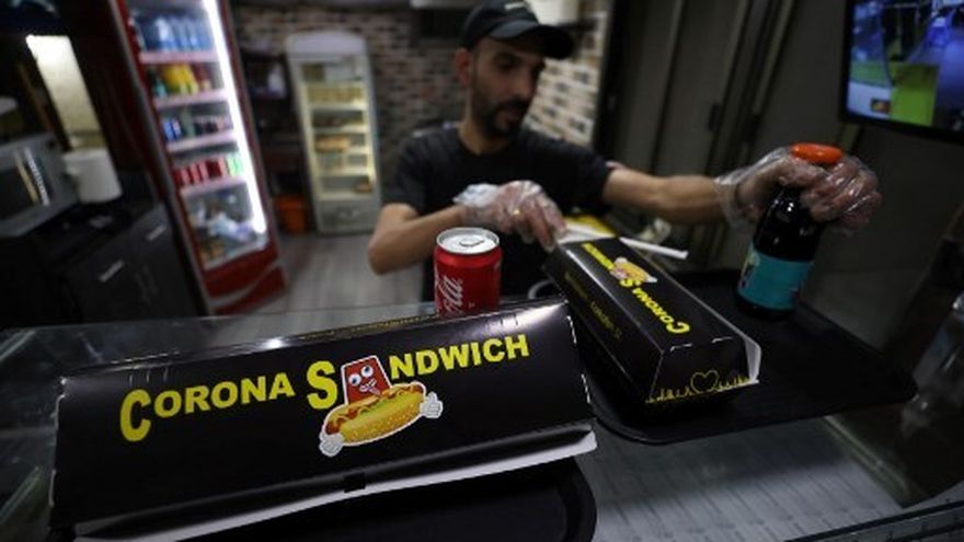 Ubicada cerca de la basílica, la pequeña cafetería es fácilmente reconocible gracias a su gran cartel, rojo y amarillo, anunciando el "corona-sándwich". Su menú también incluye un “hot-dog covid-19”.