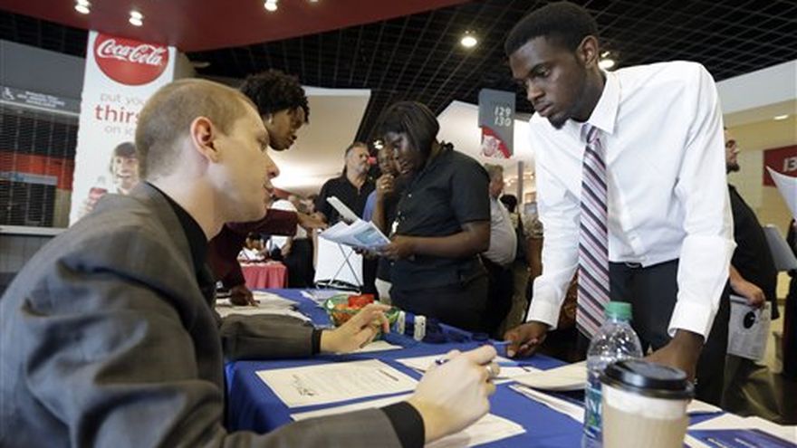 Cory McClain escucha a una reclutador en una feria de empleo en Florida, el 10 de junio de 2015. / AP