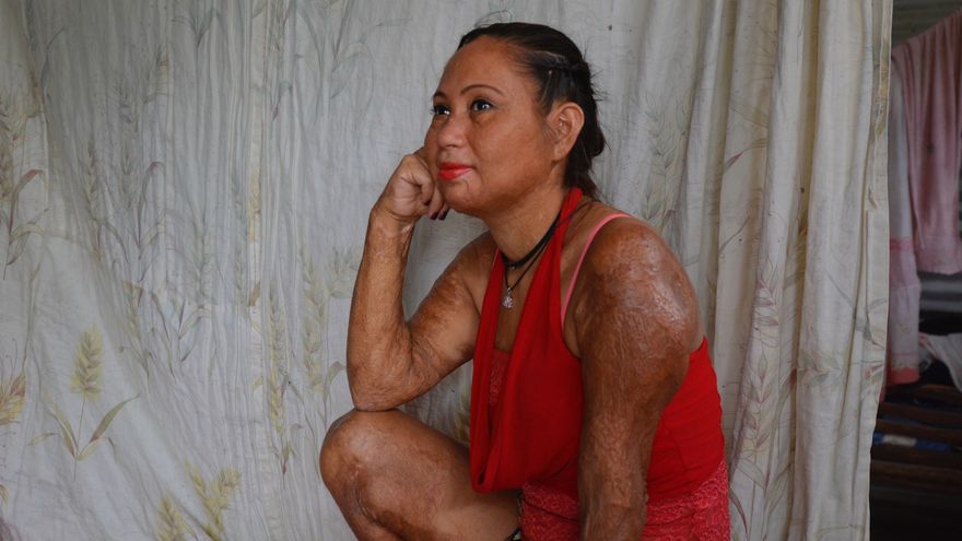 Ella tiene quemaduras en el 60 por ciento de su cuerpo, su rostro, sus piernas y brazos muestran la huella de aquel aciago día.