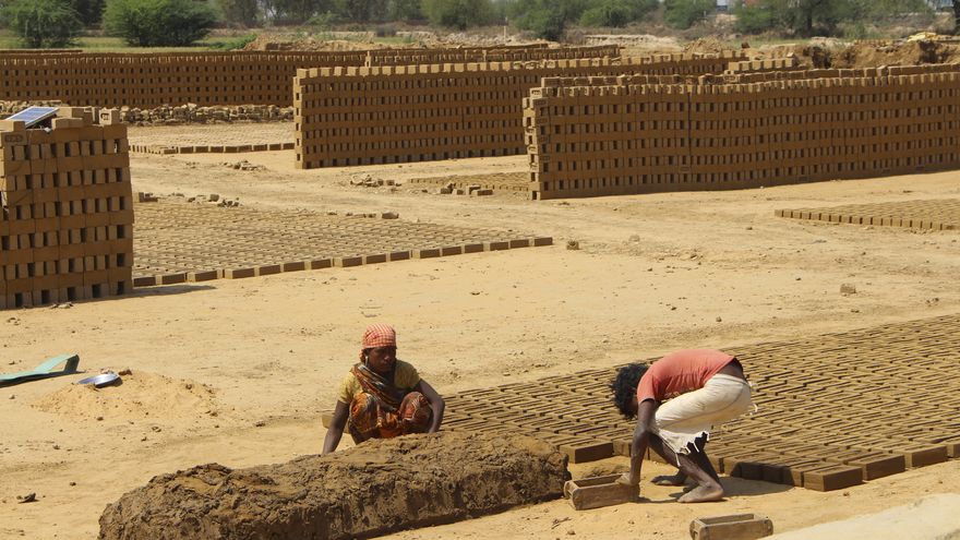 Anil Manjhi emigró hace una década desde el este de la India a Jhajjar, en el estado norteño de Haryana, para trabajar en un "bhatta", como se denominan en hindi a las fábricas de ladrillos, en la que cobra 18,000 rupias mensuales (unos 257 euros) por producir manualmente mil unidades diarias.