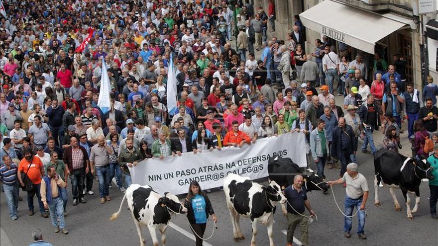 Doce mil personas, según la policía local, se han manifestado hoy en Santiago de Compostela en defensa del sector lácteo, coincidiendo con la reunión que tiene en Madrid la ministra de Agricultura, Isabel García Tejerina, con representantes de los productores, industria y distribución.