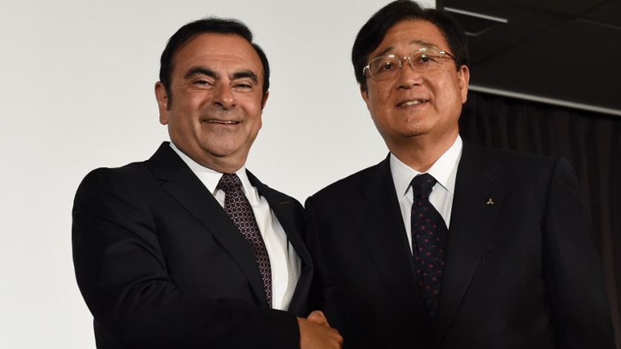 El presidente de Nissan, Carlos Ghosn y el presidente de Mitsubishi Motors Osamu Masuko al final de la conferencia de prensa conjunta en Yokohama. / AFP
