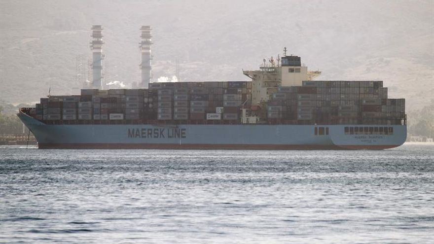 Un portacontenedores de Maers, fondeado en la bahía del puerto de Algeciras (Cádiz), durante la primera jornada de huelga. / EFE