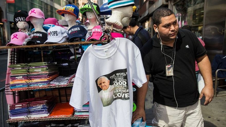La visita del Papa Francisco a los Estados Unidos, ha causado emoción y revuelo entre los seguidores del sumo pontífice. Y es que la originalidad y competencia se ha apoderado de los comerciantes en ciudades como Whashington, New York y Filadelfia, donde el máximo representante de la iglesia Católica desarrolla su apretada agenda protocolar.