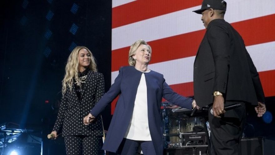 Unos de los últimos famosos en mostrar su apoyo a favor de la candidata demócrata son Beyoncé y su esposo, el rapero Jay Z. La famosa pareja se presentó el pasado 5 de noviembre en un mitín de Clinton en Cleveland, Ohio, uno de los estados clave en las elecciones presidenciales.