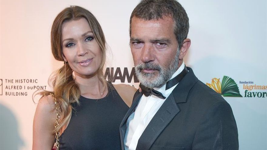 El actor español Antonio Banderas (d) posa con su novia, Nicole Kimpel (i), en la alfombra roja de la Gala benéfica de la Miami Fashion Week, en el edificio Alfred I. DuPont en Miami, Florida (EE.UU.). / EFE