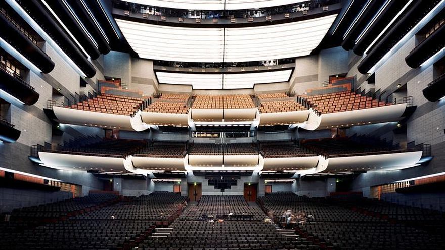 Un exquisito granito gris procedente de la Bretaña decora las paredes, mientras la madera de peral, anaranjada, de China, y el acero negro de balcones y asientos recuerdan inevitablemente a los colores de la orquesta.