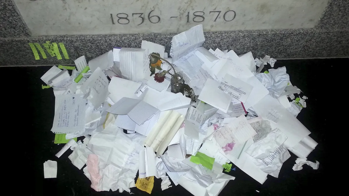 Depositar cartas, notas y poesías se ha convertido en una romántica costumbre de las personas que siguen rindiendo tributo a Gustavo Adolfo Bécquer (1836-1870), de modo que en la tumba del poeta español en Sevilla (sur) siempre hay folios de gente que, de forma anónima, los deposita sobre la lápida.