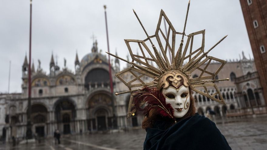 Venecia/En la famosa plaza de San Marcos, en Venecia, entre una espesa niebla, varias parejas pasean disfrazadas de nobles y los niños, también con elegantes atuendos, lanzan confeti. Empieza el carnaval pero, este año, en versión covid, sin turistas y en gran parte telemático.