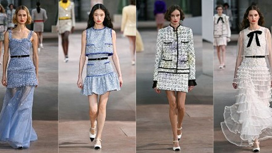 El día para la mujer Chanel empieza con trajes de tweed blanco, amarillo pastel, verde agua o lila, continúa con tonos más vivos y se termina con vestidos de gala azul oscuro y negro.