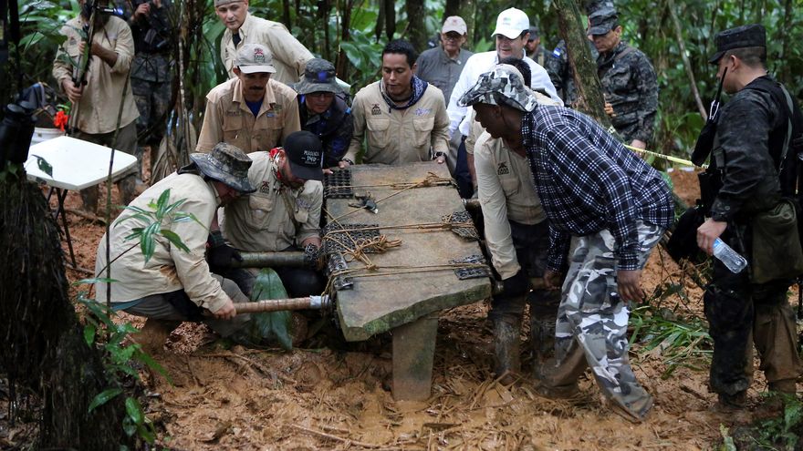 El gobernante acompañó a un equipo de arqueólogos que extrajo la pieza de más de un metro de largo y medio de ancho hallada en Kaha Kamasa, Ciudad Blanca en dialecto misquito, de la que se viene hablando en Honduras desde hace varias décadas, pero poco se había informado a fondo.