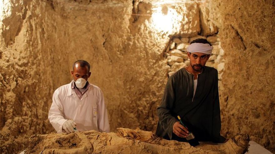 El ministro explicó que además de objetos funerarios, los arqueólogos hallaron "una momia envuelta en lino" y que los primeros análisis apuntan a que podría ser "un alto funcionario o una persona poderosa".