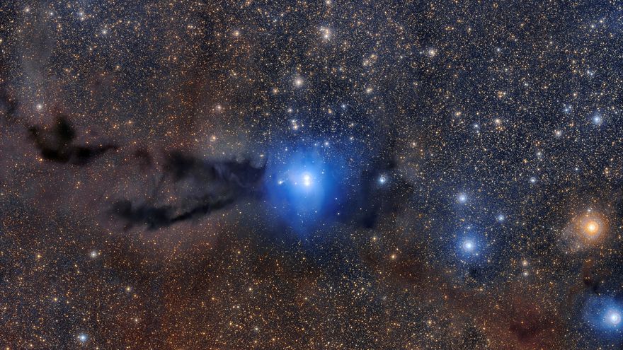 La composición más detallada realizada hasta el momento de la región de formación estelar Lupus 3 muestra una nube oscura de polvo cósmico con apariencia de serpiente deforme, iluminada por la brillante luz de las dos nuevas estrellas azules que centran esta espectacular imagen de amplio campo.