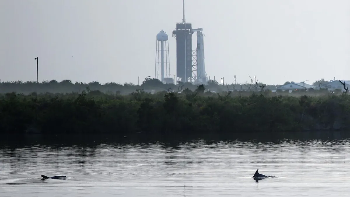 Delfines nadan en una laguna cerca del complejo de lanzamiento 39A en el amanecer del Kennedy Space Center en Florida hoy 30 de mayo de 2020. / AFP
