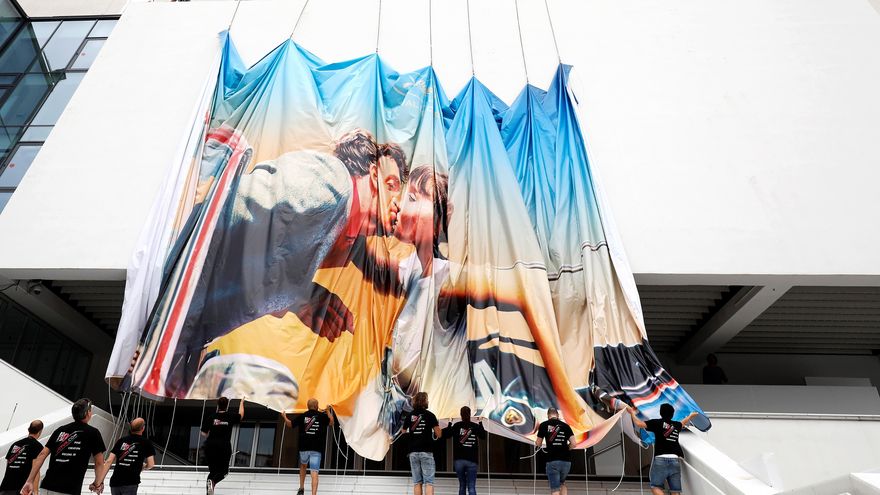 A la vista de todos, el beso entre Jean-Paul Belmondo y Anna Karina, cartel que corona el Palacio con sus once metros de alto y 25 de largo y decora también comercios y paneles, haciendo omnipresente la sombra de Jean-Luc Godard, director de "Pierrot el loco", la película de la que se ha extraído la imagen.