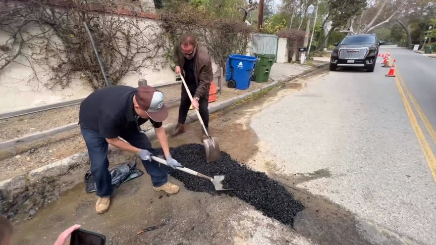 El actor de 75 años tomó una pala y empezó a rellenar con asfalto la calle de su vecindario que se encontraba destruida.