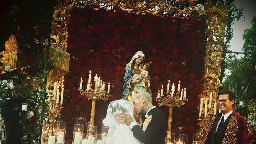 En la ceremonia, Kourtney lució un minivestido blanco con corsé de Dolce & Gabbana que estaba cubierto con delicados detalles de encaje floral, combinado con un largo velo de Kourtney. Además de una imagen de la virgen María, las palabras “Familia, Lealtad y Respeto” también estaban inscritas en el velo. Travis optó por un tradicional smoking negro con pajarita. Los novios encargaron a la famosa fotógrafa de moda Ellen Von Unwerth que inmortalizara su boda.