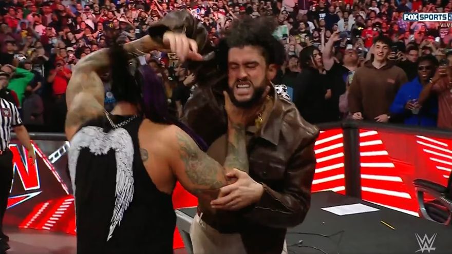Luego de que Bad Bunnuy le diera un puñetazo al hijo de Rey Mysterio, Damian Priest salió en su defensa y lo arrojó sobre la barandilla, lo atacó, y luego lo estrelló contra una de las mesas del lugar.