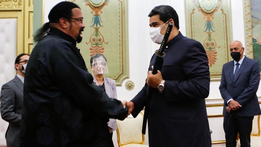 Caracas/El actor y productor estadounidense Steven Seagal entregó una espada samurái al presidente venezolano Nicolás Maduro, durante una visita al palacio de gobierno en Caracas transmitida el martes por la televisión estatal.