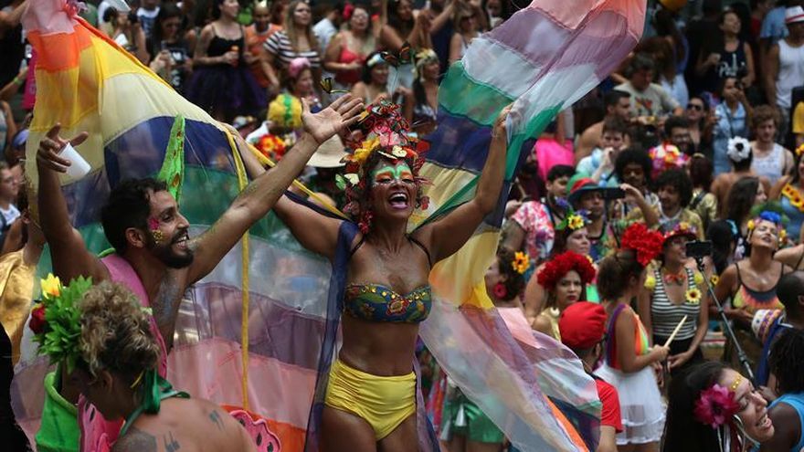 Fue lo que se vio entre los integrantes del Cordão da Bola Laranja, una comparsa que reunió en la céntrica plaza de Cinelandia a decenas de personas con vistosos disfraces y alegorías, y que desfiló a primera hora de la tarde de este viernes hacia una calle vecina en la que se juntó al bloco Vem Cá, Minha Flor.