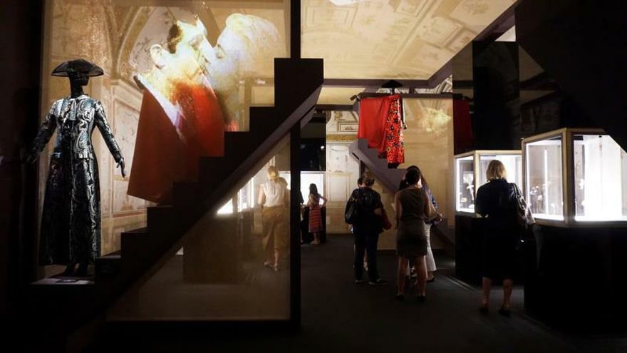 Unos 80 trajes de alta costura de maestros de la moda italiana y procedentes de una colección privada se exponen sobre maniquíes intercaladas entre las instalaciones y arcos que acogen la muestra.