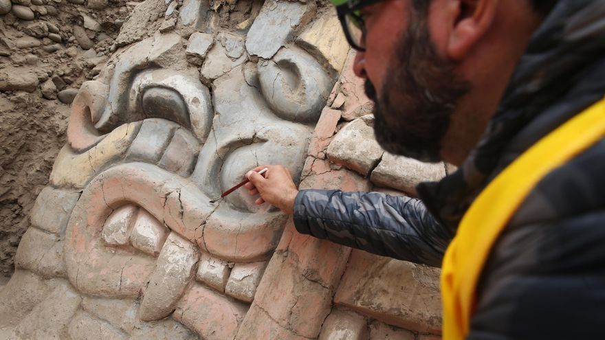 Feroces y temibles rostros de serpientes y felinos multicolor, entre otras representaciones de quiméricas criaturas mitológicas del Antiguo Perú, comenzaron a emerger en los muros de un templo que se excava en pleno corazón de Lima, tras permanecer enterradas durante siglos, ajenas a la vorágine urbana.