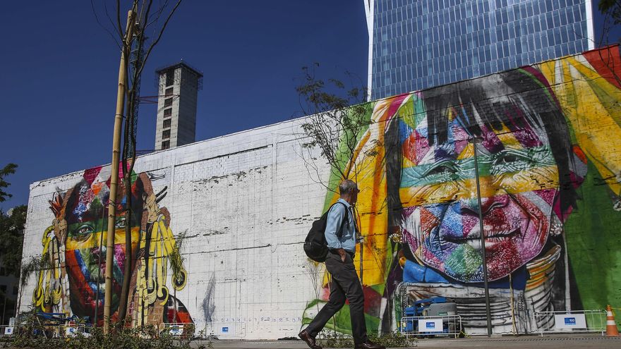 El nuevo mural, bautizado como "Todos somos uno" y que ocupa la totalidad de la pared frontal de un estacionamiento abandonado en el puerto de Río de Janeiro a lo largo de una cuadra, retrata los rostros de cinco indígenas, uno por cada continente.