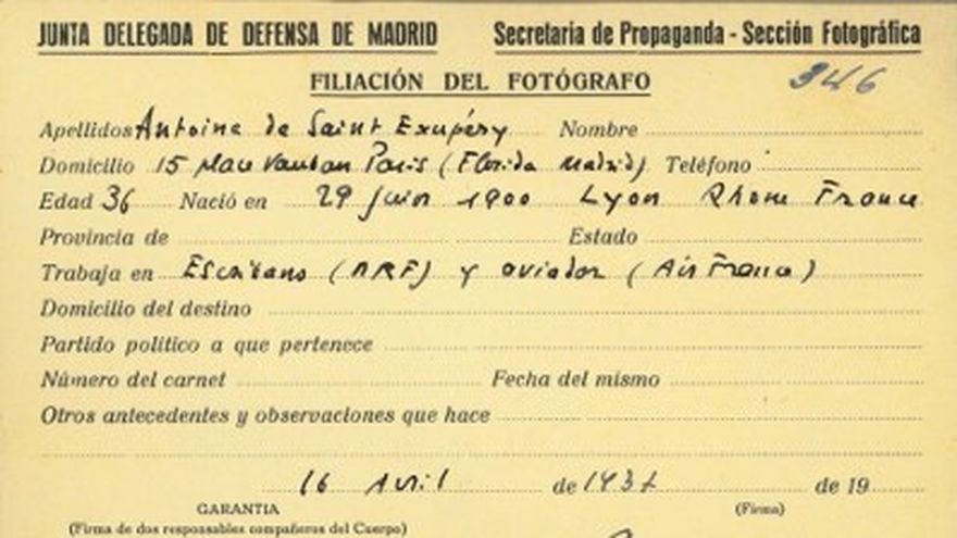 Con 36 años en ese momento, Saint-Exupéry que parece haber rellenado el mismo la ficha, se presenta como aviador y "escribano", probablemente un error de traducción del francés "écrivain" (escritor).