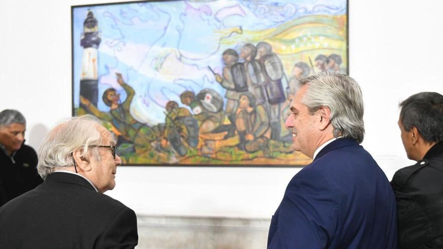 La muestra incluye también una pintura sobre los refugiados que conoció en la isla de Lesbos (Grecia) y episodios de la historia contemporánea argentina.