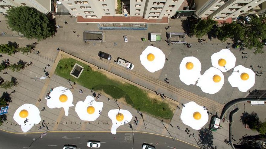 Cerca de la emblemática torre, en la Plaza Baquedano, se ha instalado la intervención urbana "Art-Eggccident", formada por una docena de huevos fritos gigantes que convierten el espacio en una "gran sartén de ocurrencias cómicas", según los organizadores.