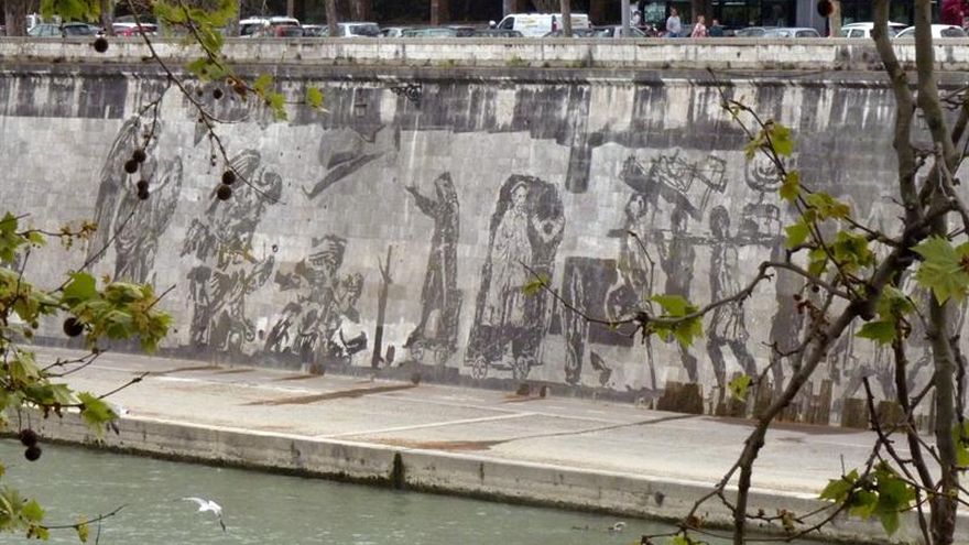 Los principales hitos de la historia de Roma, con sus momentos de apogeo y sus infinitas penurias, han resurgido en los muros de la ribera del Tíber gracias a un gran mural que los ilustra a partir de la suciedad incrustada con el paso del tiempo.