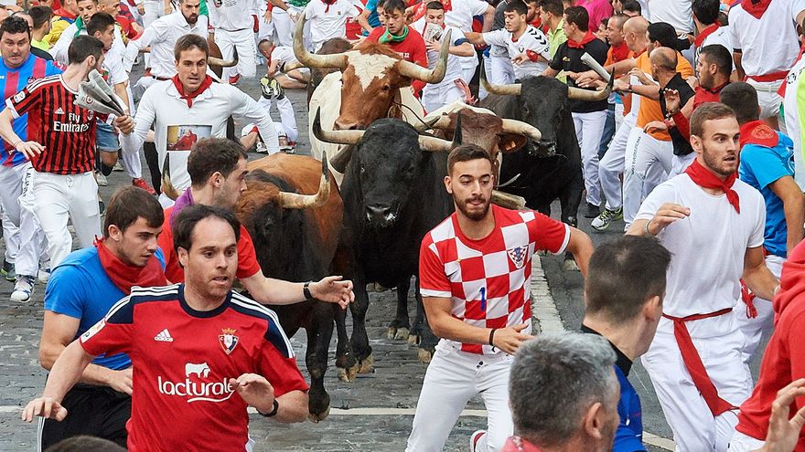 Durante una semana, cada mañana a las 08H00 (06H00 GMT) centenares de 'mozos' ataviados de camisa y pantalón blancos y con un pañuelo rojo al cuello corren delante de los toros por el centro de Pamplona, después de encomendarse a la imagen de San Fermín.