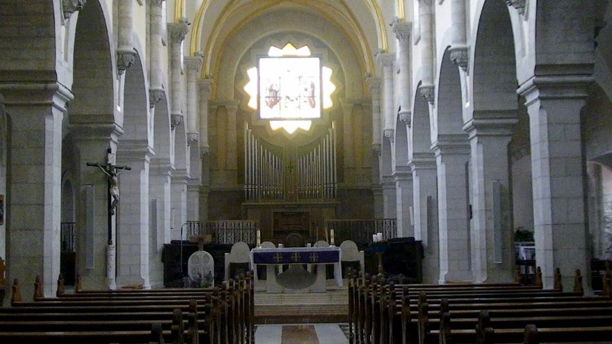 En la iglesia actual se conservan suelos de mosaico del edificio original. El sitio incluye conventos e iglesias latinas, griegas, ortodoxas, franciscanas y armenias, así como campanarios, jardines en terraza y una ruta de peregrinación.