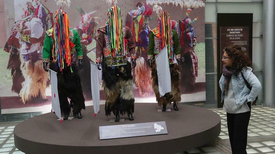 Trajes con fibras de llama o de corteza de árbol, para invocar espíritus o vestir a "guerreros solares", forman parte de una exposición que invita a recorrer las regiones de Bolivia para conocer la diversidad de colores, diseños y materiales que emplean los pueblos indígenas del país en su vestimenta.