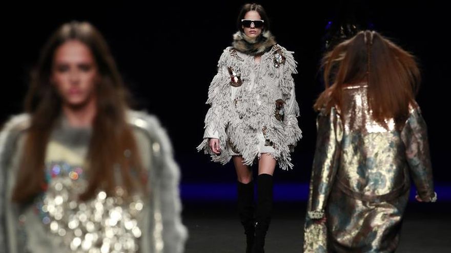Una colección invernal con mucha luz en la que no faltan vestidos livianos, despegados del cuerpo, tan "oversize" como los abrigos y "bombers" que los cubren, metalizados y dorados, que en ambas propuestas destacan por los apliques metálicos y relieves de animales engarzados tanto en delanteros como en espalda.