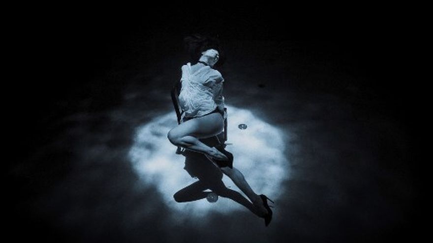 Una luz cenital modela el cuerpo de Hafez creando claroscuros. Con tacones de aguja, camisa blanca y ropa interior negra, la bailarina española contonea su silueta bajo el agua, creando un ambiente onírico.