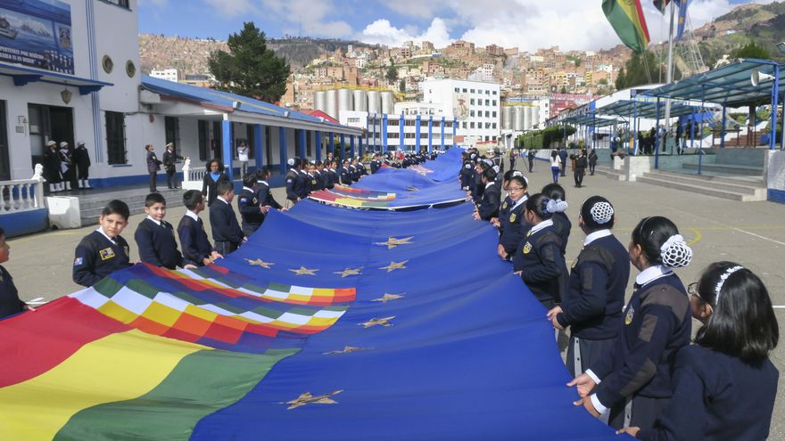 Alumnos de la Unidad Educativa Héroes del Pacífico en La Paz entregaron a la Armada boliviana los primeros 70 metros de la bandera, con la que el próximo 10 de marzo Bolivia espera batir el récord.