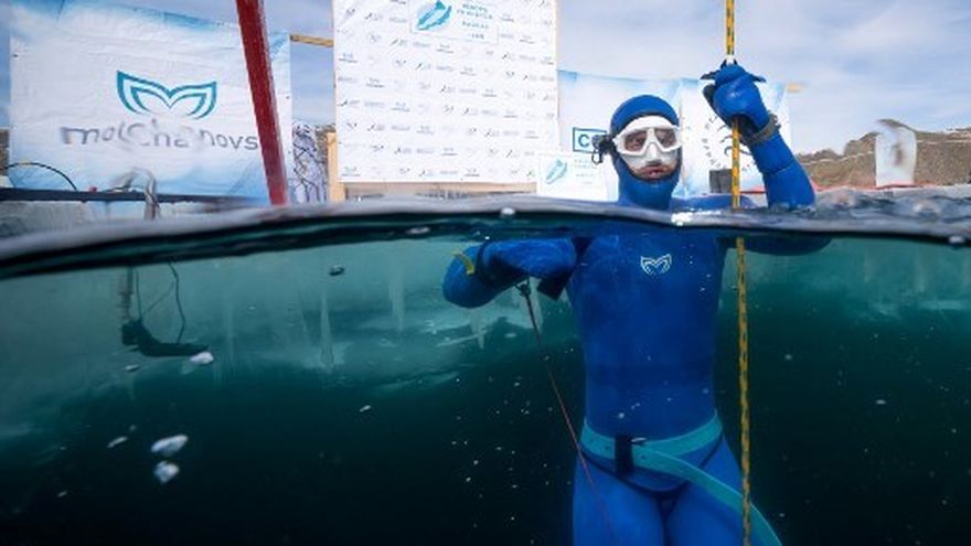 Con un traje de buceo azul, Molchanov se sumergió a través de una amplia abertura hecha en el hielo, ante un pequeño grupo de periodistas y espectadores. Unos minutos más tarde, volvió a aparecer, sonriendo.