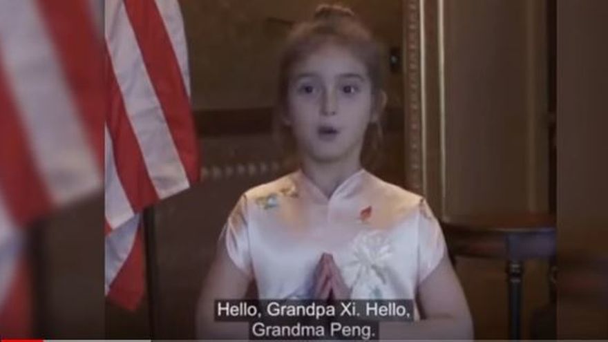 Tras haber saludado en mandarín al "abuelo Xi" y a la "abuela Peng" Liyuan, esposa del dirigente chino, la niña entonó en chino una canción y recitó un poema antiguo, todo ello ataviada con un vestido tradicional.