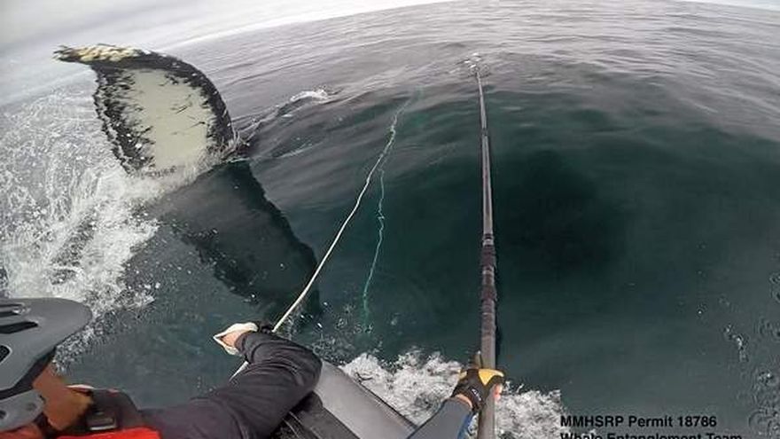 La ballena fue detectada por primera vez la semana pasada cerca de Moss Landing en el condado de Monterey. Tenía la mandíbula superior deformada y una de sus aletas inmovilizadas por las redes.