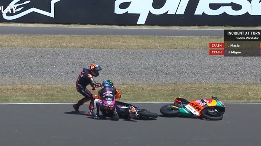 Tras dos largos años de ausencia por las restricciones a causa de la pandemia del Covid-19, el Campeonato Mundial de Motociclismo regresó a la ciudad de Río Hondo, en Santiago del Estero, Argentina y más allá de la adrenalina que se vivió en la pista, también dejó una imagen impactante en la categoría Moto3 cuando los pilotos Jaume Masia y Andrea Migno sufrieron un percance que se volvió viral e hizo recordar a la ya fatídica cachetada entre Will Smith y Chris Rock en los premios Oscar.