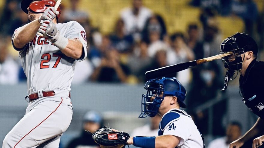 En una cuenta de 3-2, Trout golpeó una pelota con tanta fuerza que su bate se destrozó y un gran trozo de madera astillada golpeó al árbitro del plato Nate Tomlinson justo en la cara.