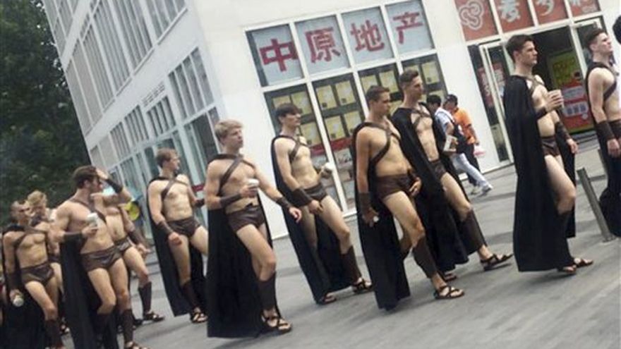 Unos 40 hombres de pelo rubio o castaño vestidos con pantalones cortos, sandalias, grebas y capas al estilo de la antigua ciudad griega de Esparta marcharon por el distrito comercial de Beijing y un centro comercial de lujo el miércoles. Los hombres, que portaban ensaladas en bandejas de plástico, atrajeron multitudes y posaron para fotos con mujeres que tuvieron amplia difusión en las redes sociales.