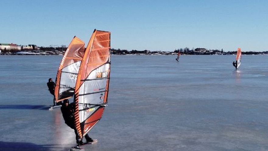 El windsurf sobre hielo puede alcanzar los 100 km/h en el decorado mágico y soleado del Báltico helado, un deporte minoritario que se practica en los estertores de este invierno boreal en las costas de Finlandia.