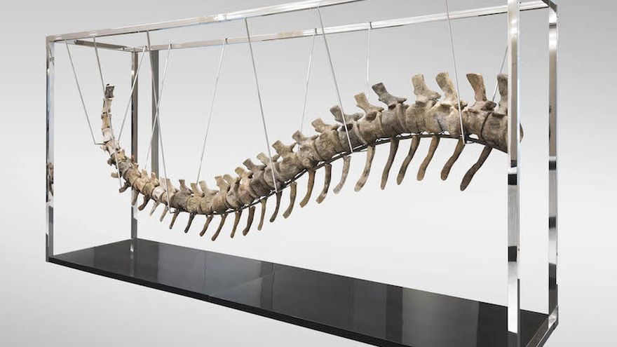 Esta cola fosilizada de dinosaurio, de cuatro metros y un peso de 180 kilos, fue vendida en 1,8 millones de pesos (96.774 dólares) en la subasta del pasado 16 de enero de la Casa Morton de México.