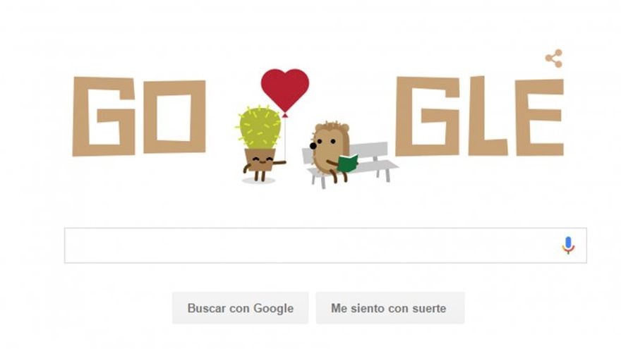 El primero de los doodles de Google muestra a una cafetera dándole una rosa a un tetera. El siguiente se aprecia a un puercoespín siendo sorprendido por un cactus con un globo en forma de corazón.
