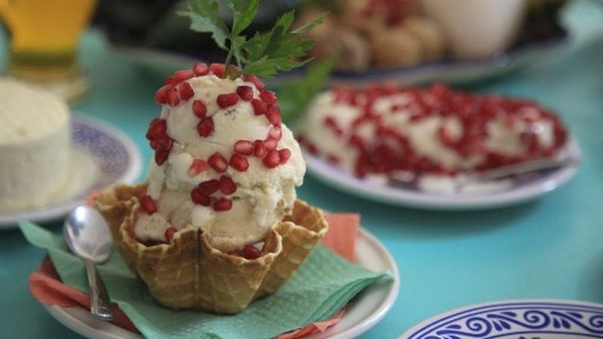 "El helado lleva todo lo que un chile en nogada: granada, perejil, nuez de castilla, pera, manzana panochera, carne de cerdo... todo es natural, sin saborizantes", afirma este veterano con 48 años de experiencia y cuya creación se vende por el equivalente a dos dólares.